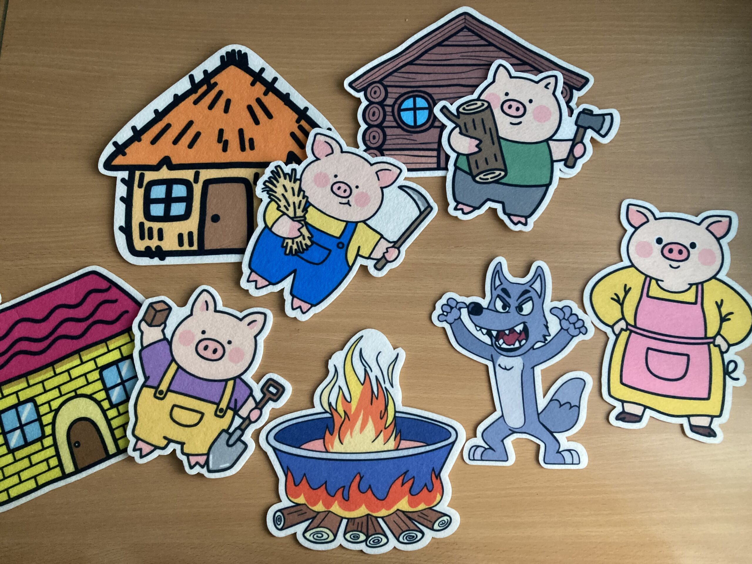 Kõik komplektis olevad rekvisiidid ja nukud on vildist.